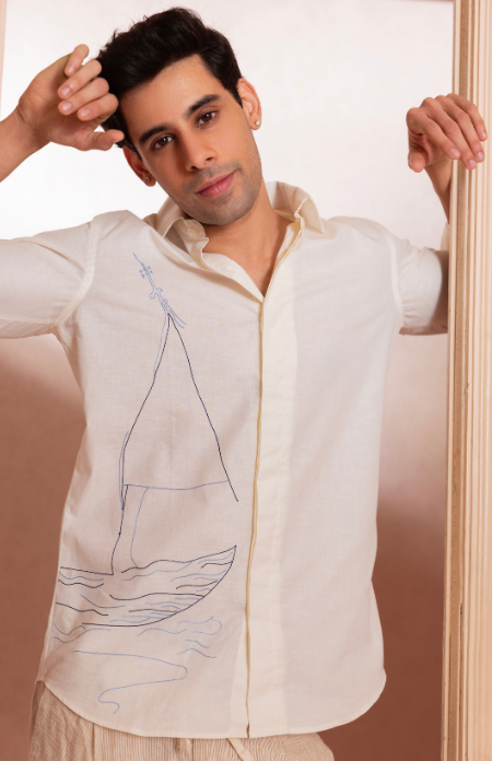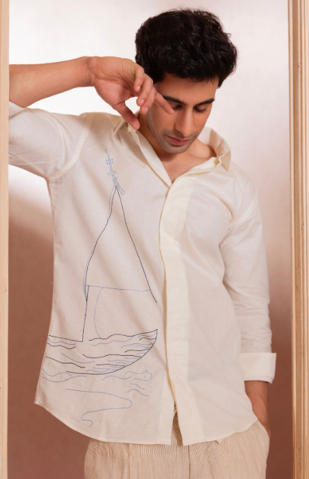 An off-white Lenin shirt featuring a serene boat sailing across, perfectly capturing the spirit of a summer adventure.