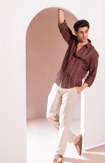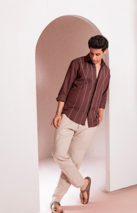 A brown Lenin shirt with intersecting white lines from top to bottom , offering a stylish and bold summer look.
