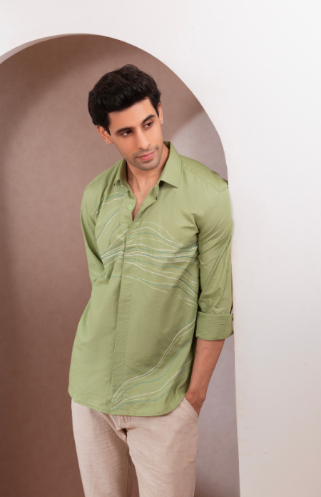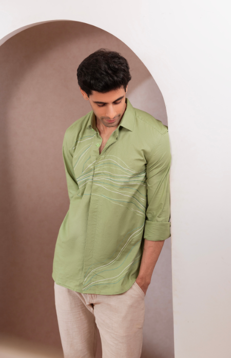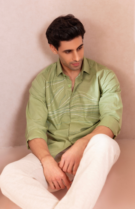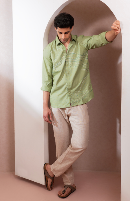 A light green Lenin shirt with subtle shades of green lines flowing across, evoking the refreshing vibe of a summer breeze.